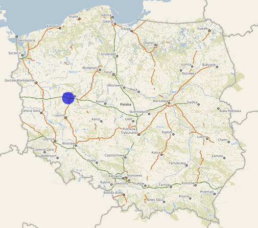 | Współrzędne i wysokość środka | X: 501116, Y: 340050, H: 85 m (PL-1992; PL-EVRF2007-NH) |